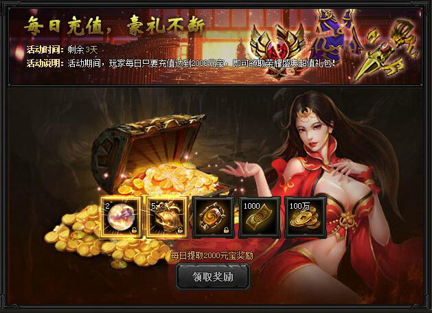 【活动内容】活动期间,每天只要充值达到2000元宝,即可领取荣耀盛典超值礼包!