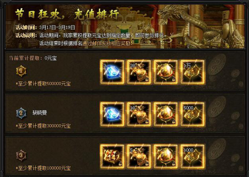 【活动内容】活动期间,累计提取元宝达到指定金额,即可参与排行。